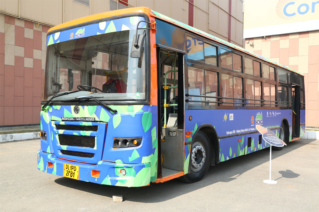 A bus running on CNG spiked with Hydrogen at IndianOil’s R&D Centre. Trials on the novel technology using H-CNG as a clean fuel will begin in the national capital soon.