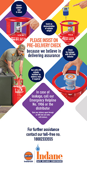 Indane delivery boys have been equipped with pre-delivery check kits for checking leakage from valve and defective 'O' Ring. Electronic weighing machines are available with the delivery boys to show the weight of the cylinder to the customer. IndianOil has a round-the-clock 24x7 LPG Complaints Emergency No. 1906 to receive and monitor complaints. IndianOil customers today can make payments for refills by using e-wallets, credit/debit cards, net banking as well as mobile apps.