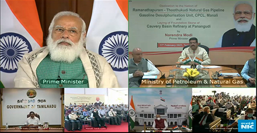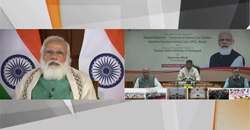 The Prime Minister Shri Narendra Modi dedicated to the nation and laid the foundation of key projects of the oil and gas sector in Tamil Nadu today via video conferencing. Prime Minister dedicated to the nation the Ramanathapuram - Thoothukudi natural gas pipeline and Gasoline Desulphurisation Unit at Chennai Petroleum Corporation Limited, Manali. He also laid the foundation stone of Cauvery Basin Refinery at Nagapattinam. Governor and Chief Minister of Tamil Nadu, and Union Minister for Petroleum and Natural Gas were present on the occasion.
