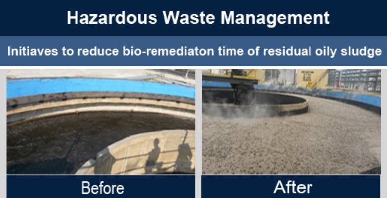 Prevent, Reduce, Reuse and Recover are the fundamental principles that govern all our activities, more so in case of solid waste management. Oily / chemical / biological sludge generated from storage tanks during refinery turnarounds or from the basins & storage tanks of our effluent treatment facilities are mechanically handled. Melting pits with skimming pumps, sophisticated hydro-cyclones, centrifuges etc. are employed for de-oiling the sludge.