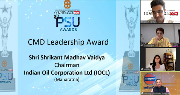 Chairman, IndianOil, Mr Shrikant Madhav Vaidya, was conferred the prestigious CMD Leadership Award at the Governance Now 8th PSU Awards Ceremony held today on a virtual platform for leading IndianOil to exemplary performance during 20-21