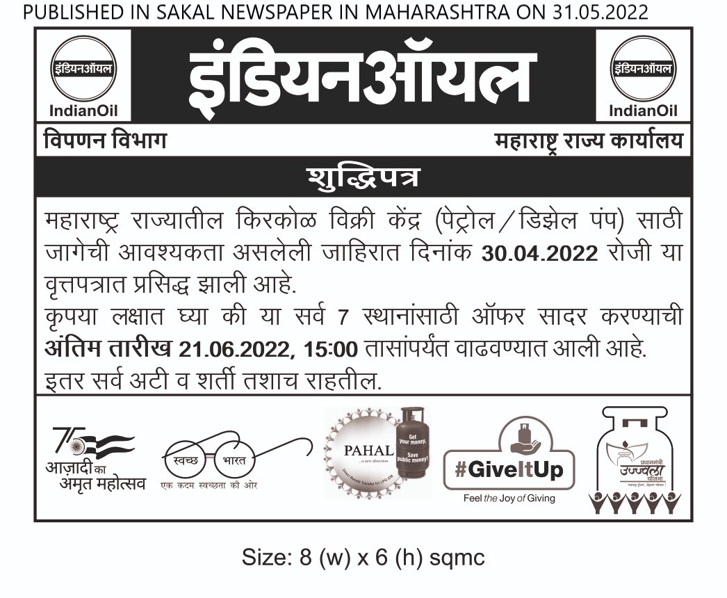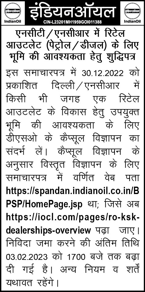 Corrigendum requirement of Land for Retail Outlet (Petrol/Diesel) in NCT/NCR