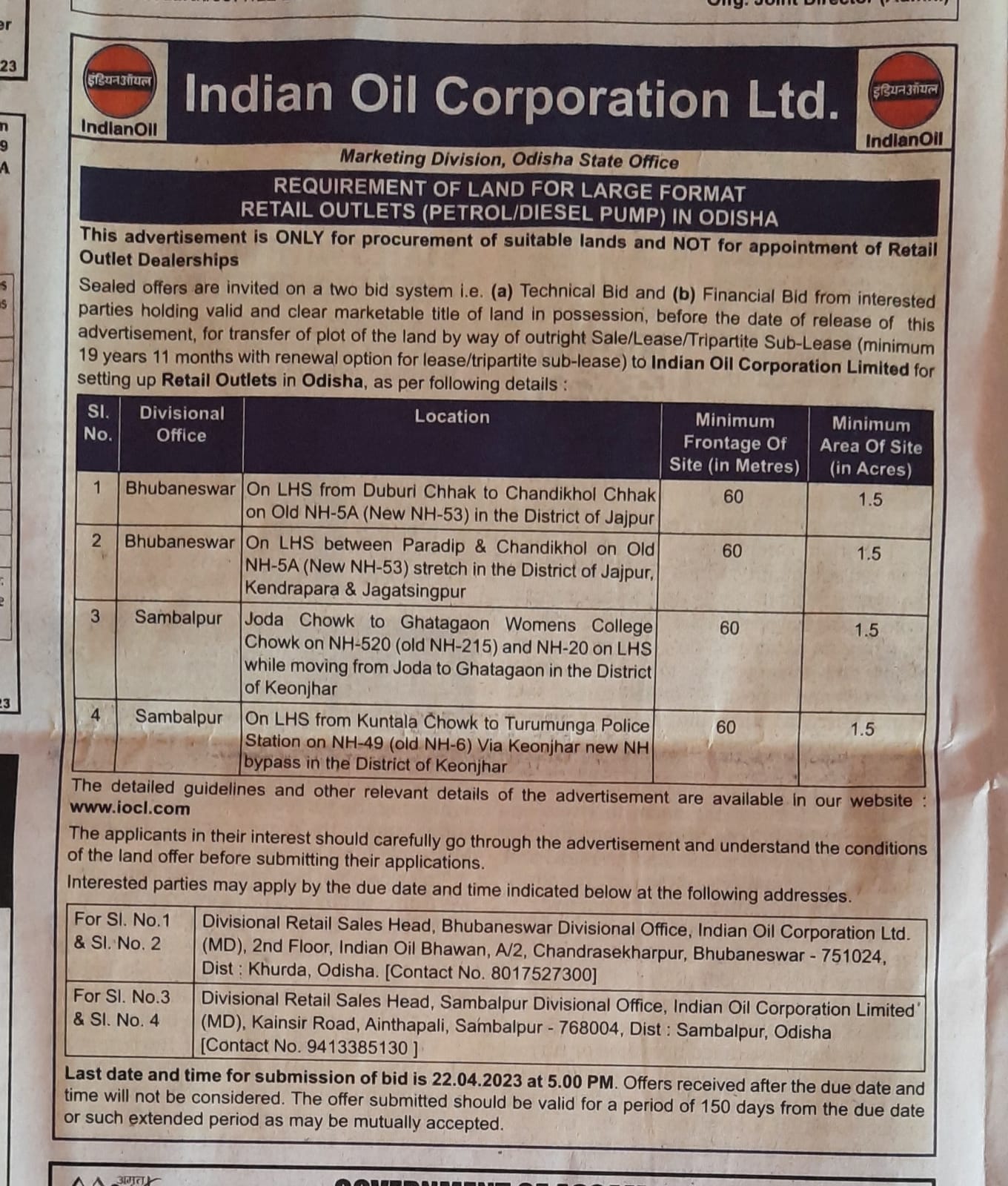 Requirement of Land for Retail Outlet (Petrol/Diesel Pump) in the state of Odisha - Corrigendum